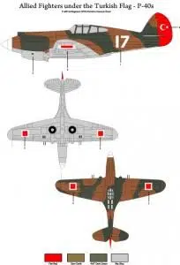 YERLİ ÜRETİM. Turkish Air Forces P-40E and P-40B(48001) This decal set corresponds to the markings on the P-40B and P-40E aircrafts that served in the Turkish Air Force in the period of 1942-1948. The set allows you to complete 3 full profiles. This top quality decal set is printed by the company Microscale. It is possible to make 2 full profiles of the E model with 6 different number alternatives. The guidebook enclosed to the sticker set demonstrates in details painting patterns and marking emplacements.