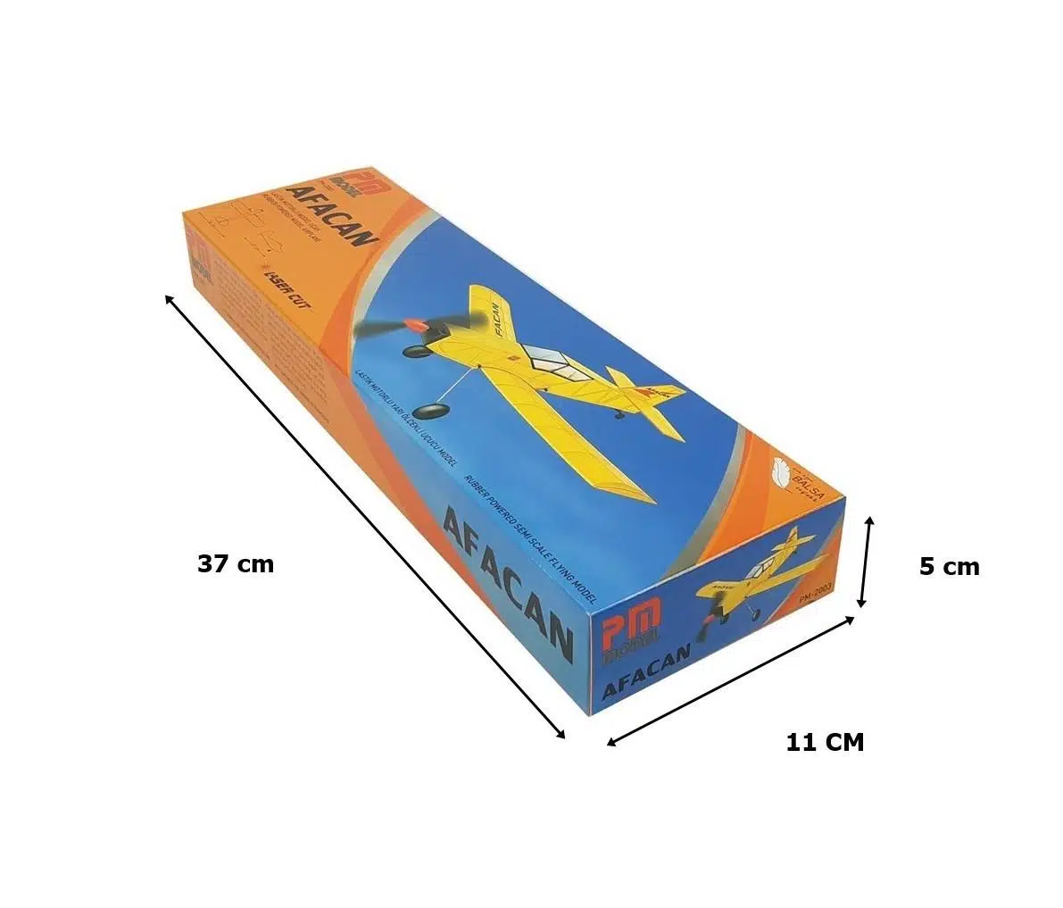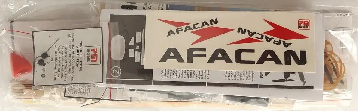 Afacan modelimiz lastik motorlu, gövdeli alttan kanatlı yapımı çok kolay modeldir. Tüm inşaat lazer kesim olup balsa ağacındandır.Afacan modelinin kutusu içinde CNC de bükülmüş iniş takım teli, plastik pervane, plastik tekerlekler, plastik başlık, plastik arka tekerlek, plastik kanat bağlama pimleri ve çıkartma seti vardır.